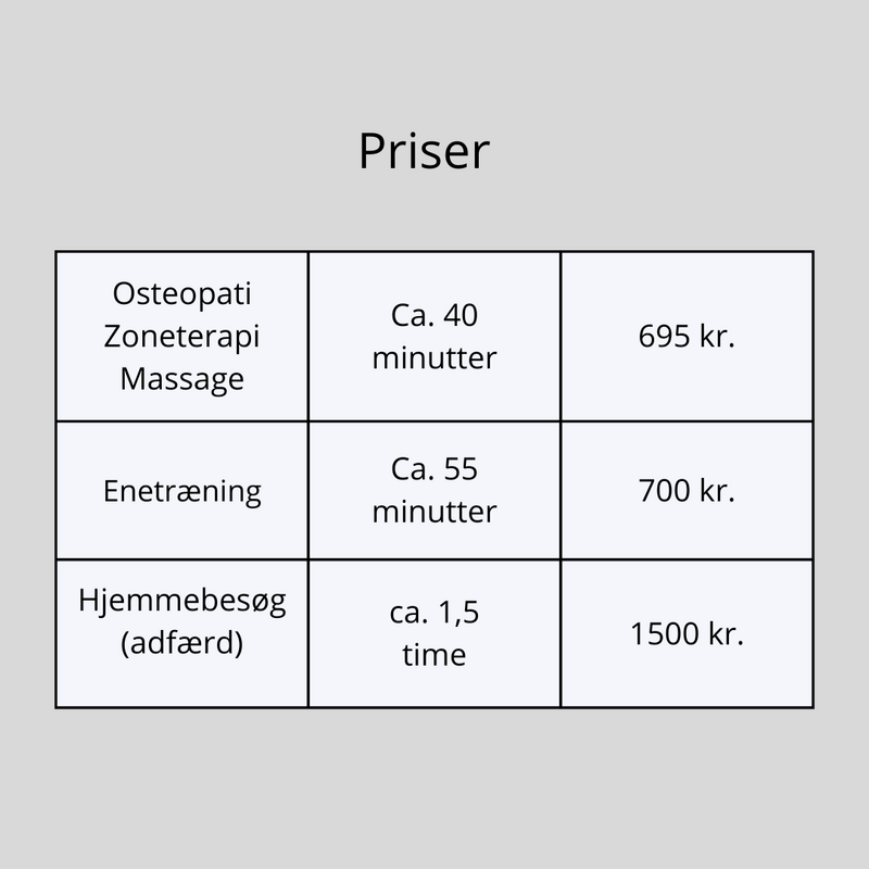 Hjemmebesøg foregår hos dig, og prisen inkluderer op til en halv times kørsel hver vej.